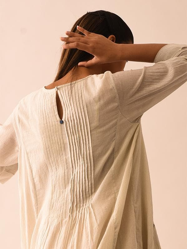 Elevate your wardrobe with this handwoven cotton dress, adorned with stylish stripes and designed with a flattering three-quarter sleeve. Ideal for day-to-day wear or casual outings, it combines comfort with effortless elegance.
